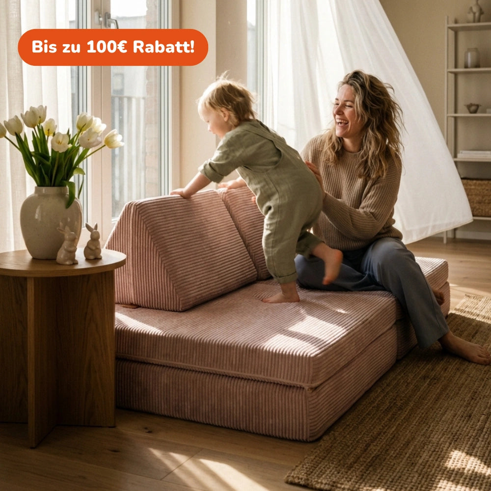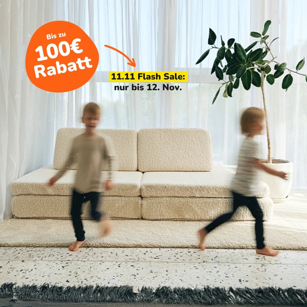 Angetrieben von unserem kunterbunten Alltag mit insgesamt vier Kindern waren Felix und Michael auf der Suche nach einer Mischung aus vielseitigem Spielzeug und Sofas, die nachhaltig genutzt werden und sich den wechselnden motorischen und geistigen Fähigkeiten im Laufe der Kindheit anpassen.