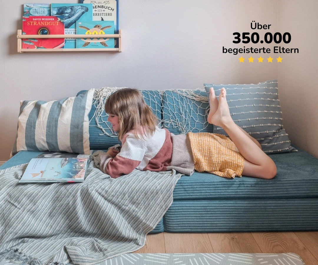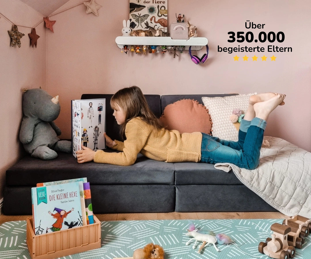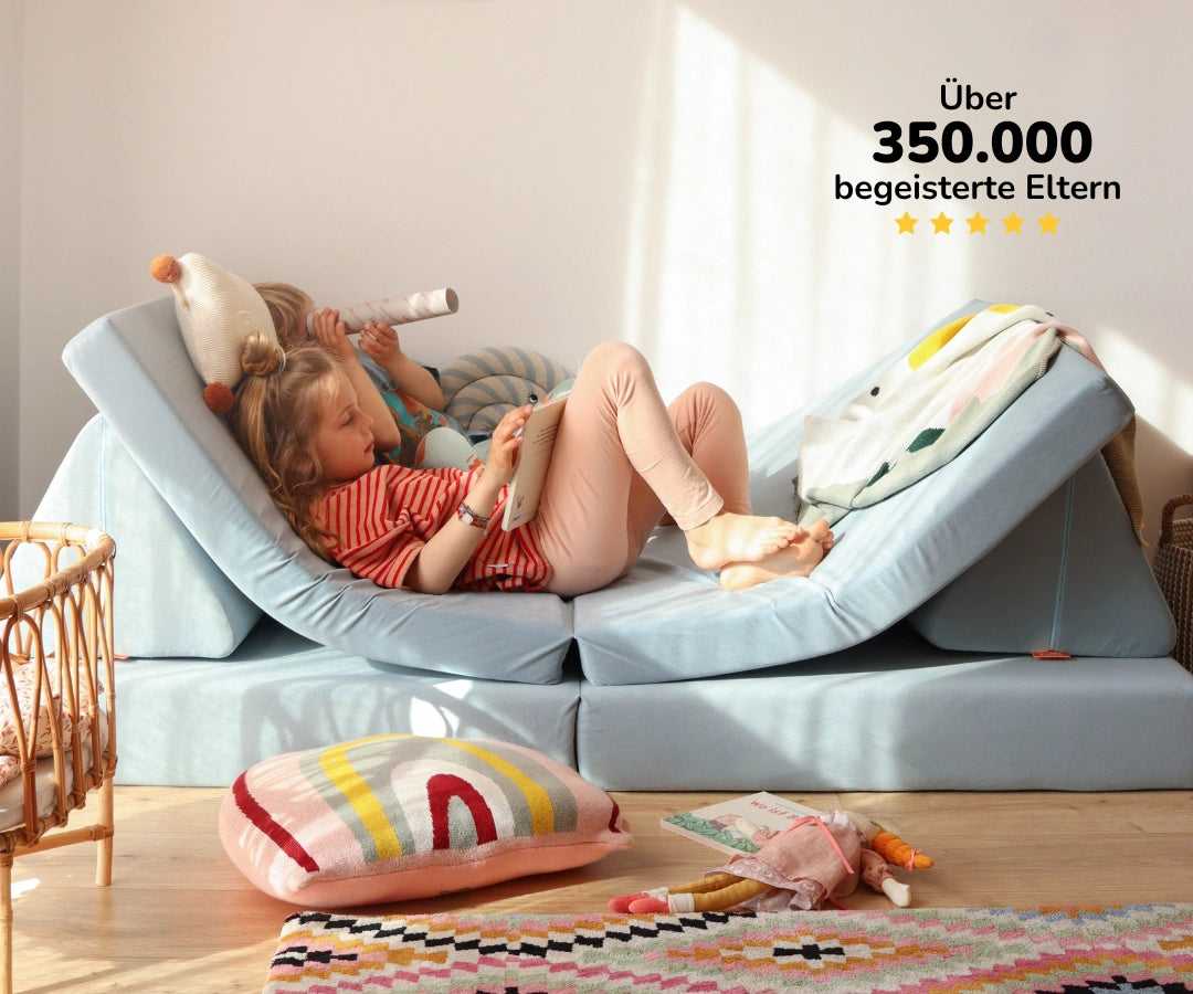 Es verwandelt sich im Handumdrehen von einer gemütlichen Kinderzimmer-Couch in eine Kletterlandschaft, eine Höhle oder in ein Gästebett, wenn alle vom Toben gehörig müde geworden sind. So wird das Sofa zum Mittelpunkt im Kinderzimmer und fördert das freie Spiel, die Fantasie und die motorische Entwicklung.
