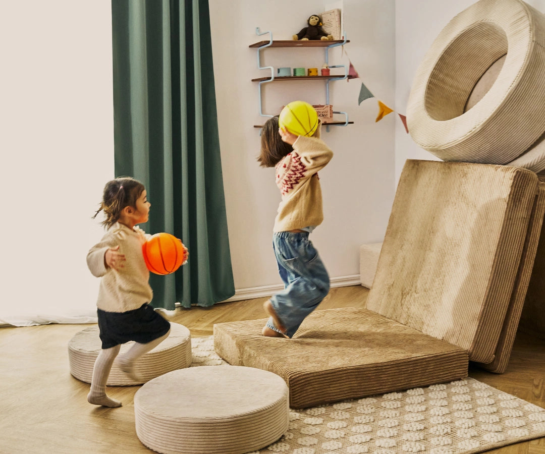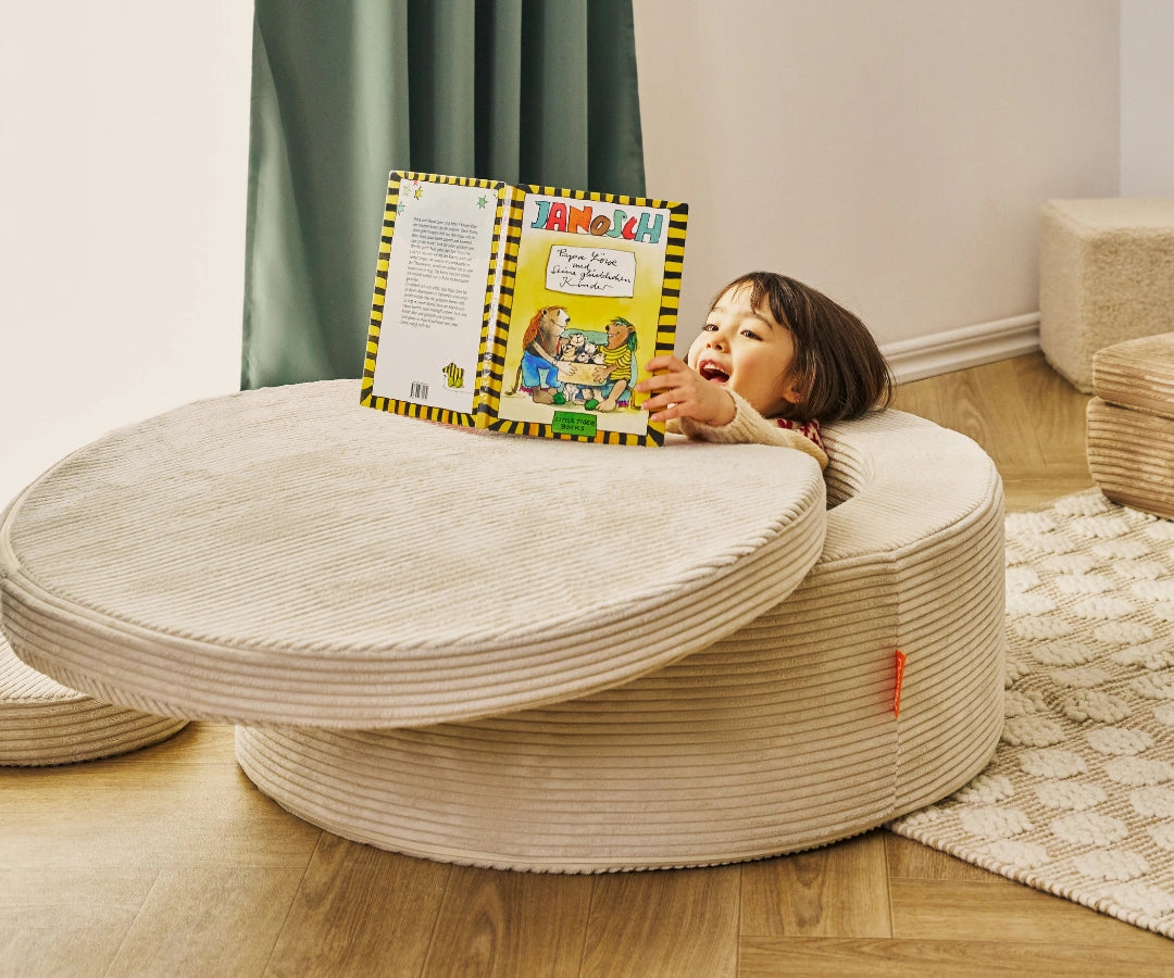 Stable foam, soft corduroy cover, no hard edges, zippered pockets and washable covers: children can jump, balance, throw balls and you can stand relaxed next to them.
