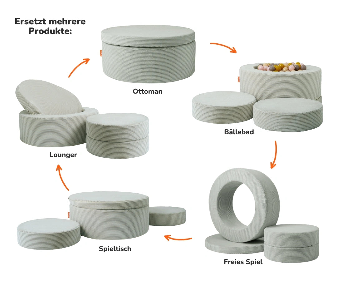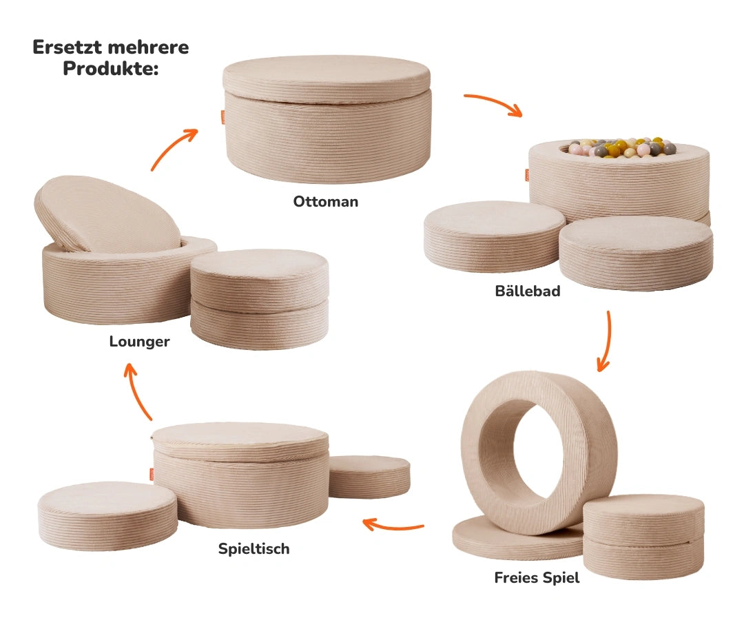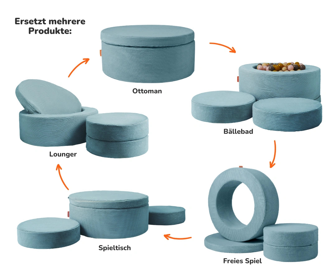 Ball pit, balance ring, jumping zone, cave, platform, table, chill-out lounger, or add-on for the play sofa. The donut replaces many individual toys and yet never feels the same.