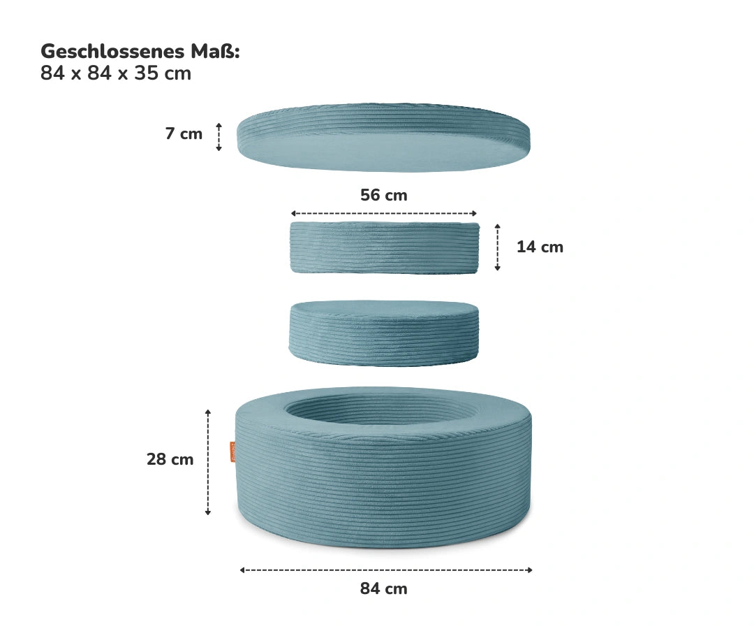 The donut, in its basic form, has an outer diameter of approximately 84 cm and a height of approximately 35 cm. This makes it large enough to sit in, jump in, and balance on, yet compact enough for living rooms and children's rooms.