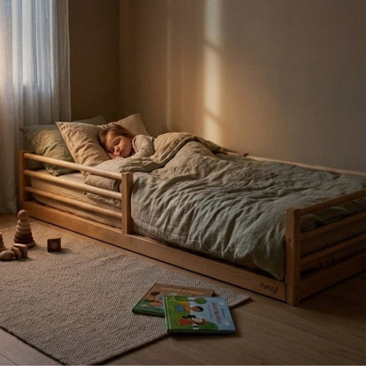 Die erhöhten, abgerundeten Seiten des Funzy Bodenbetts schützen Kleinkinder ab 10 Monaten zuverlässig vor dem Herausfallen und schaffen ein sicheres Schlafumfeld. Durch den niedrigen Bodenabstand können Kinder selbstständig ein- und aussteigen. Gefertigt aus FSC-zertifiziertem Massivholz und schadstoffgeprüften Materialien ist das Bett robust, langlebig und umweltfreundlich. Dank modularer Bauweise mit wechselbarem Rausfallschutz und separat erhältlichen Umbau-Set wächst es vom Kleinkind- zum Kinderbett und begleitet dein Kind über viele Jahre hinweg.