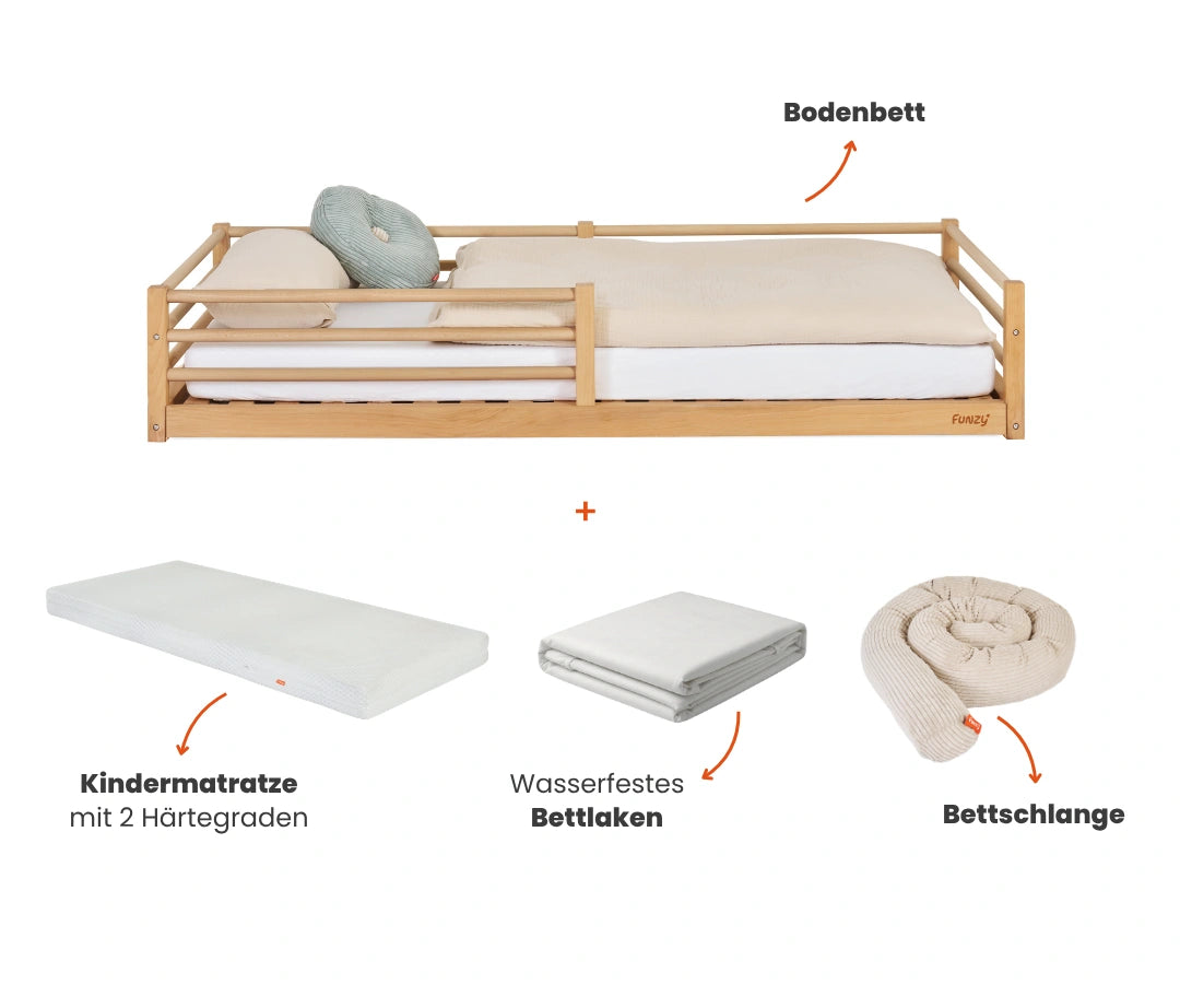 Das Funzy Bodenbett Nestbau Full Care Set ist die durchdachte All-in-One-Lösung für sicheren, gesunden und selbstständigen Kinderschlaf. Bett, Rollrost, Matratze, wasserfestes Spannbettlaken und Bettschlange sind perfekt aufeinander abgestimmt und schaffen von Anfang an eine rundum gemütliche Schlafumgebung – ideal für Kinder ab ca. 10 Monaten.