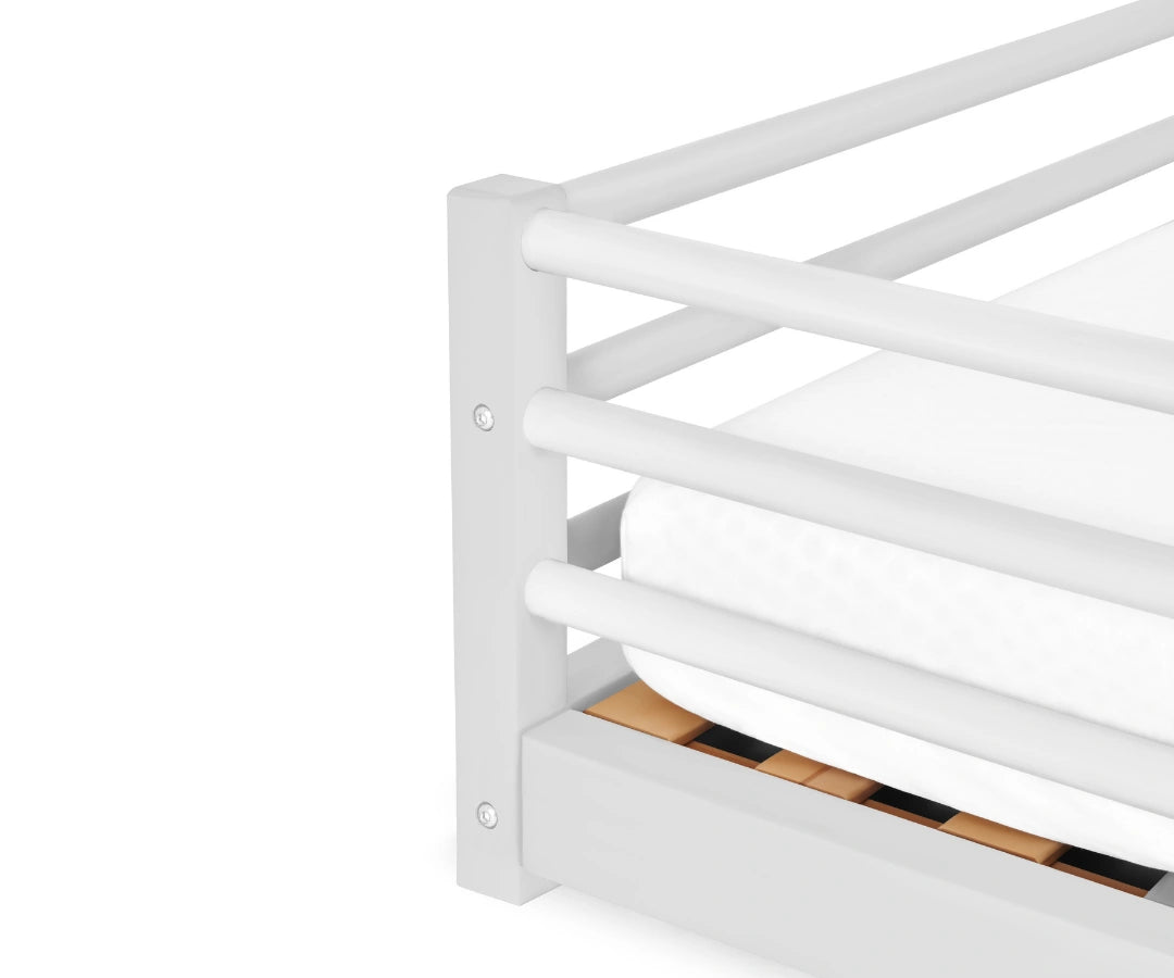 Dank der niedrigen Einstiegshöhe können Kinder selbstständig ins Bett gehen und wieder aufstehen. Das stärkt ihr Selbstvertrauen und unterstützt sie spielerisch in ihrer Entwicklung. Die erhöhten Seitenteile mit sanft abgerundeten Rundstäben bieten Schutz und sorgen gleichzeitig für eine offene, freundliche Atmosphäre im Kinderzimmer.