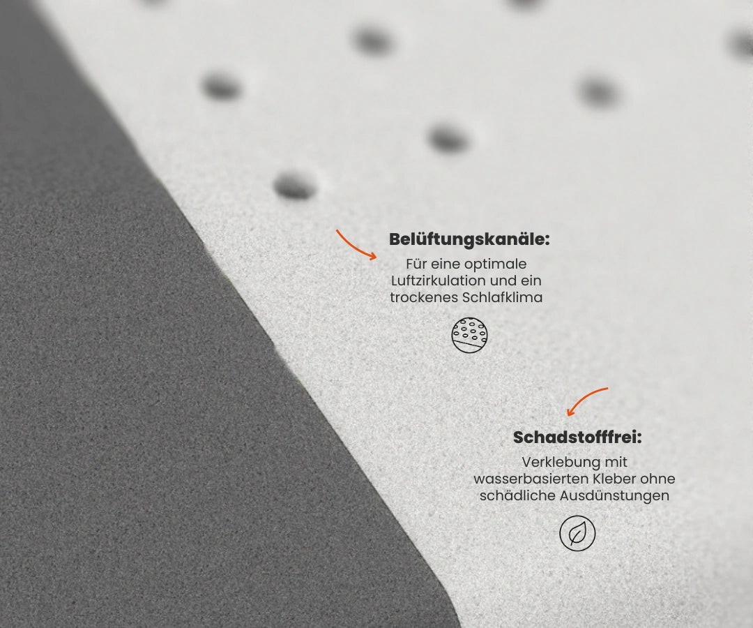 • Punktelastischer Kaltschaumkern und atmungsaktive Lochung im Schaumkern – stützend und formstabil, fördert Luftzirkulation und verhindert Wärmestau